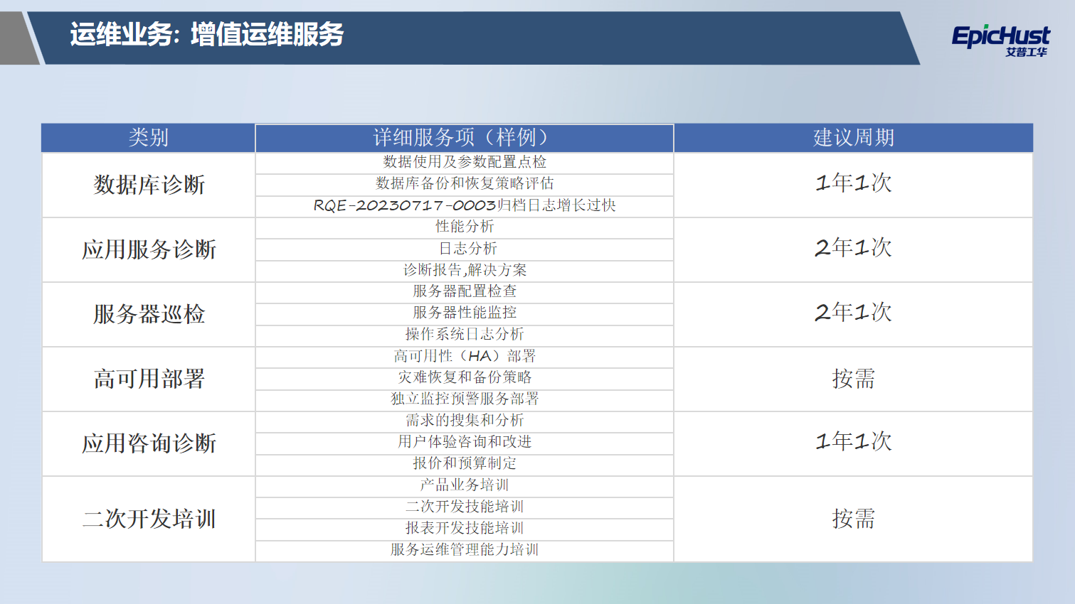 在產(chǎn)品運(yùn)維基礎(chǔ)上,我們進(jìn)一步提供增值運(yùn)維服務(wù),包括但不限于數(shù)據(jù)庫(kù)診斷、應(yīng)用服務(wù)診斷、服務(wù)器巡檢、高可用部署、應(yīng)用咨詢?cè)\斷和二次開(kāi)發(fā)培訓(xùn)。通過(guò)深入的問(wèn)題診斷、細(xì)致的日常巡檢、專業(yè)的性能優(yōu)化和定制化的功能補(bǔ)充,我們更有力地預(yù)防和解決異常情況,從而進(jìn)一步提升系統(tǒng)的穩(wěn)定性和可用性,為您的業(yè)務(wù)運(yùn)行提供更全面、更高效的保障。